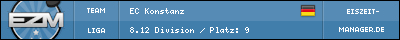 Der EC Konstanz ist wieder zurück im EZM! Der EC Konstanz hat schon früher einmal im EZM mit gespielt, von der 109 bis zur 145 Saison. Der ECK war der erste Verein vom Bodensee im EZM, auch wenn eine lange Unterbrechung den Verrein mit gezeichnet hat, hat man nie aufgehört den Sport zu lieben und den Verein zu unterstützen in Konstanz.
